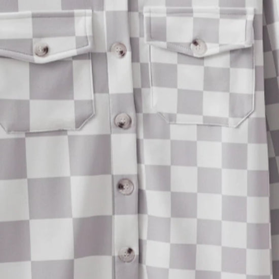 Experience the perfect blend of shirt and jacket with thisKhaki Checkerboard Flap Pocket Shacket. Featuring aclassic checkerboard patternand crafted from acomfortable polyester-elastane blend, this versatile piece offers a relaxed yet sophisticated look. Withfunctional flap pocketsand abutton-front design, it's ideal for effortless layering during seasonal transitions.